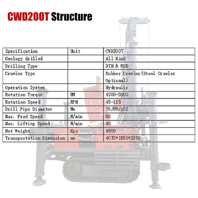 เครื่องเจาะบ่อน้ํา Rotary CWD200T ที่ติดกับ Crawler ได้ถูกออกแบบมาเพื่อปฏิบัติการเจาะหลากหลายในรูปแบบทางภูมิศาสตร์ต่าง ๆมันใช้การเจาะดินแพร่สําหรับการสร้างที่อ่อนนุ่มและอากาศ DTH มวยสําหรับการเจาะหิน, ด้วยความดันอากาศสําหรับการปล่อย slag, ให้ประสิทธิภาพสูงขึ้นมากกว่าการเจาะหมุนแบบดั้งเดิม